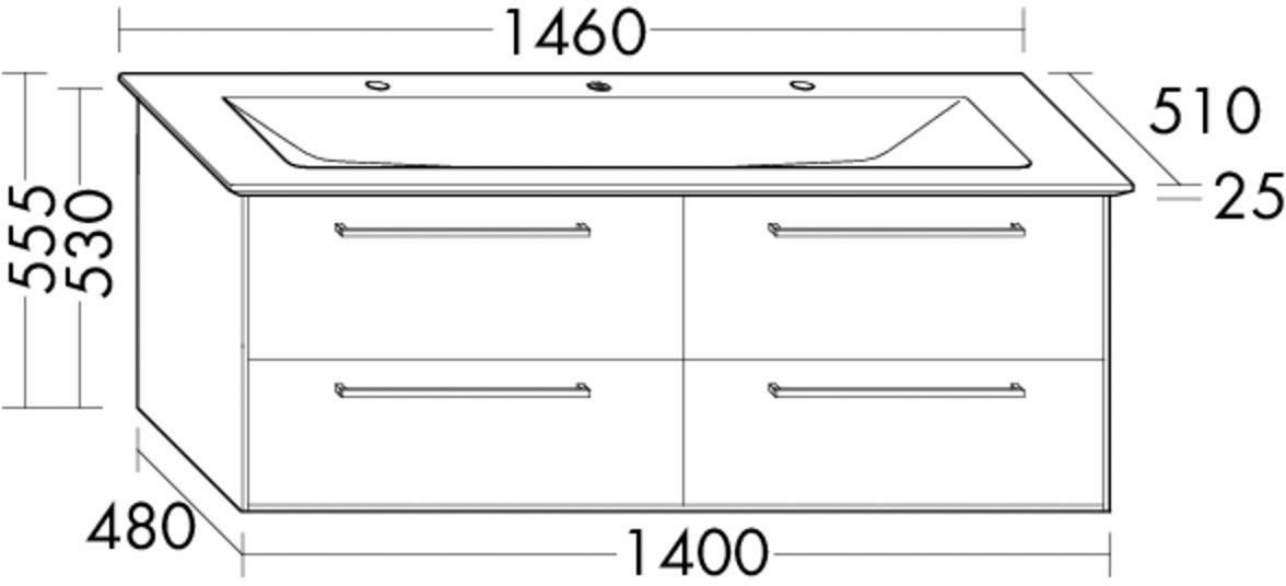 Mineralguss-Doppelwaschtisch: Muldentiefe: 120 mm, Beckenmaß 1260 x 320 mm, Waschtischunterschrank: 2 Schubladen und 2 Auszüge unten