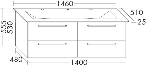 Mineralguss-Doppelwaschtisch: Muldentiefe: 120 mm, Beckenmaß 1260 x 320 mm, Waschtischunterschrank: 2 Schubladen und 2 Auszüge unten
