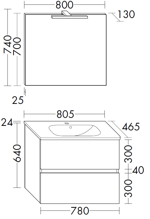 bestehend aus: Spiegel mit LED-Aufsatzleuchte, 5 W, 4000 K, Energieeffizienzklasse G, chrom, für Raumschaltung, Korpus Alu-Optik, IP44, Keramik-Waschtisch, – Muldentiefe 120 mm, Waschtischunterschrank, 2 Auszüge, 300 mm tief, mit Raumsparsiphon