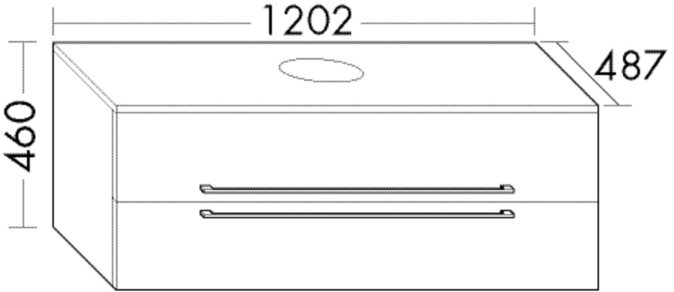1 Abdeckplatte, dekorgleich mit Front, 1 Beckenausschnitt, 1 Schublade oben, 350 mm tief, mit Siphonausschnitt, 1 Auszug unten, 350 mm tief, mit Metallkonsolen