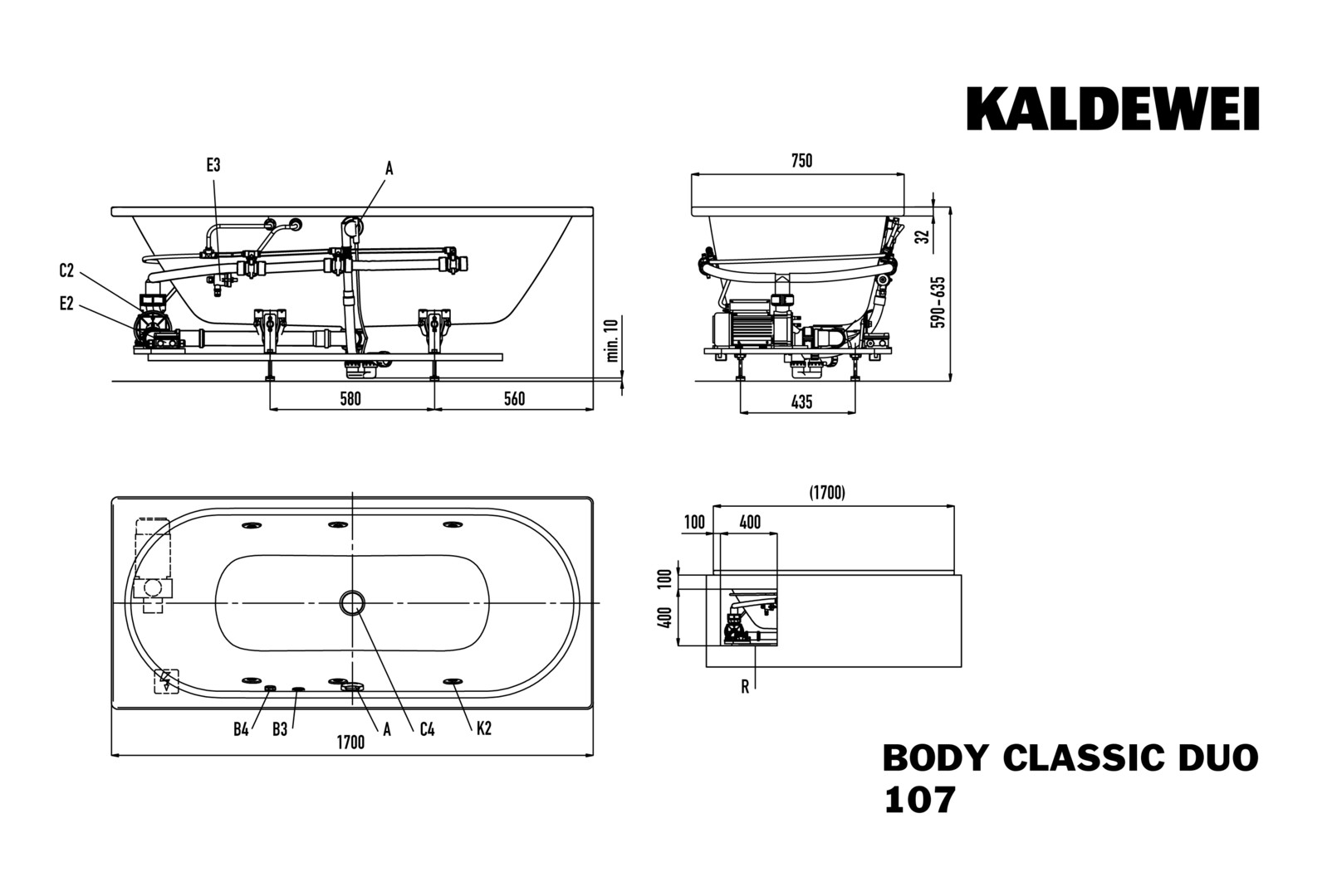 KALDEWEI CLASSIC DUO, Mod.107 BODY 1700x750mm, alpinweiß, links, integrierter Einlauf, Sichtteile chrom