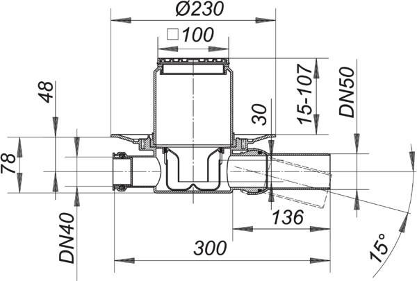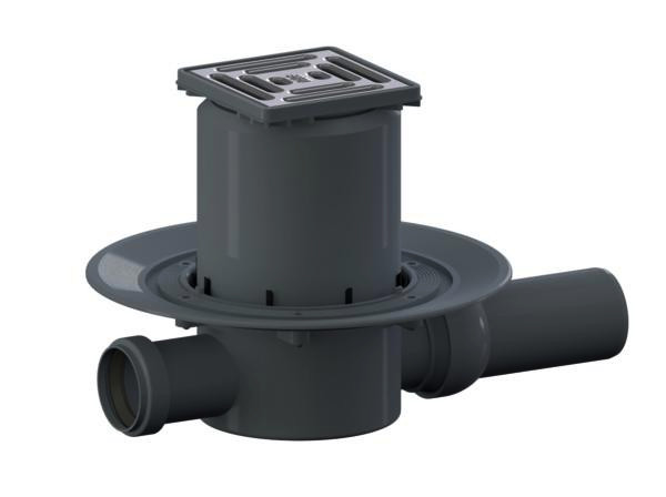 Ablaufstutzen DN 50 seitlich, mit Kugelgelenk, verstellbar von 0-15°, Zulauf DN 40, höhenverstellbarer Aufsatz E 10, herausnehmbarer Geruchs- und Reinigungsverschluss, Sperrwasserhöhe 30 mm (abweichend von DIN EN 1253), Bauschutzdeckel, Polypropylen, hochschlagfest, Rahmen ABS, Rost Edelstahl 1.4301, Befestigungsklasse K 3 (300 kg)