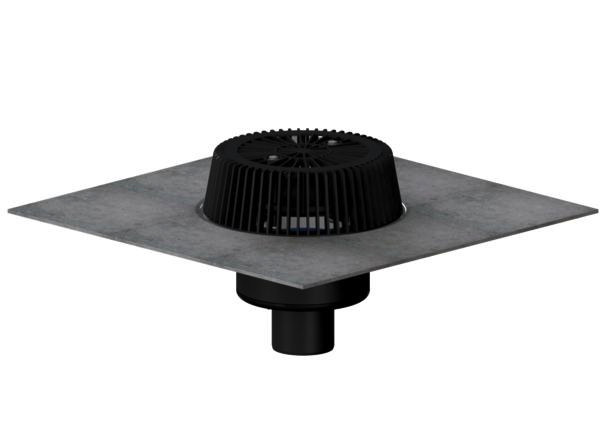 Ablaufleistungen nach DIN EN 1253, für den Einbau in Dachentwässerungsanlagen mit Druckströmung, Ablaufgehäuse wärmegedämmt, Ablaufstutzen senkrecht, SuperDrain-Einsatz, Laubfangkorb, verschraubt, Polypropylen, UV-stabilisiert, werkseitig aufgeschweißter Bitumenschweißbahn-Manschette, 500 x 500 mm, 5 mm stark, Edelstahl-Flanschring zur zusätzlichen Sicherheit