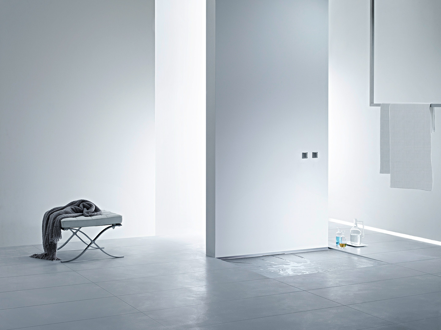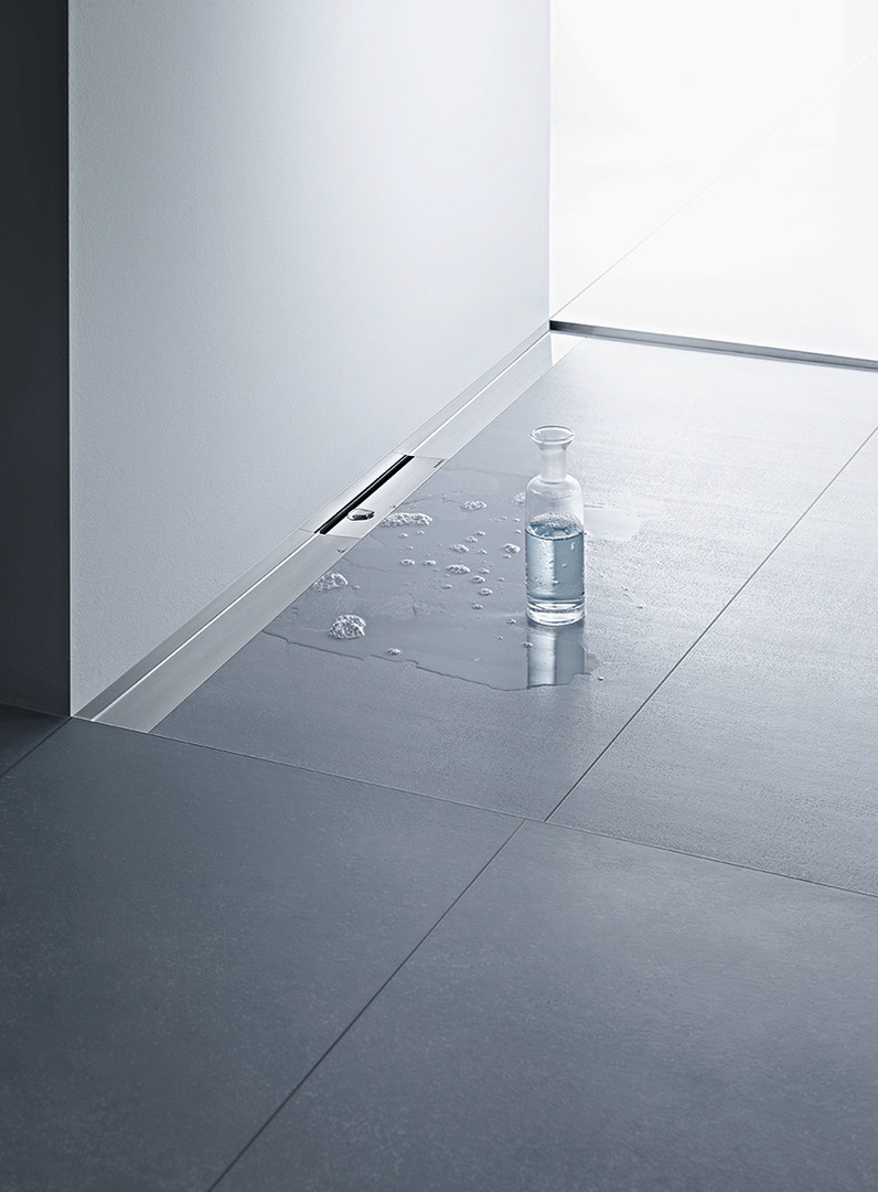 zum Einbau mit allen Ablaufgehäusen CeraFlex und DallFlex, Ablaufschiene mit mehrseitigem Präzisionsgefälle, sichtbar am Übergang zwischen Wand und Boden installiert, geeignet für keramische und Naturstein-Beläge (Boden 10-28 mm, Wand 12-28 mm, mit Kleberbett und Verbundabdichtung), Länge millimetergenau anpassbar, mit Abdeckung, selbstklebendes Sicherheitsband S 3 mit Schnittschutzarmierung aus Edelstahl zum Schutz der Flächenabdichtung und Schalldämmband zur Entkopplung vom Baukörper, Montagezubehör und Positionierhilfen, Bauschutzabdeckung, Edelstahl 1.4301, massiv 5 mm, Belastungsklasse K 3 (300 kg)