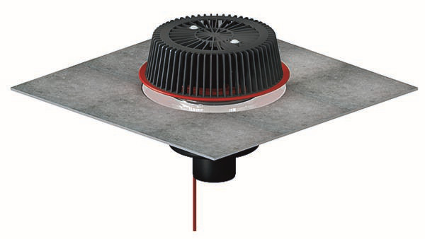 Ablaufleistungen nach DIN EN 1253, für den Einbau in Dachentwässerungsanlagen mit Druckströmung, Ablaufgehäuse wärmegedämmt, Ablaufstutzen senkrecht, SuperDrain-Einsatz, Anstauelement höhenverstellbar 28-68 mm, Laubfangkorb, verschraubt, Polypropylen, UV-stabilisiert, werkseitig aufgeschweißter Bitumenschweißbahn-Manschette, 500 x 500 mm, 5 mm stark, Edelstahl-Flanschring zur zusätzlichen Sicherheit, Direktanschluss an 230 V, Heizband nach VDE 0721, Teil 1/3.78 geprüft, Leistungsaufnahme pro Dachablauf 15 W, Rechnungswert für Absicherung pro Dachablauf 0,06 Ampere, empfohlene Absicherung pro Dachanlage 16 Ampere
