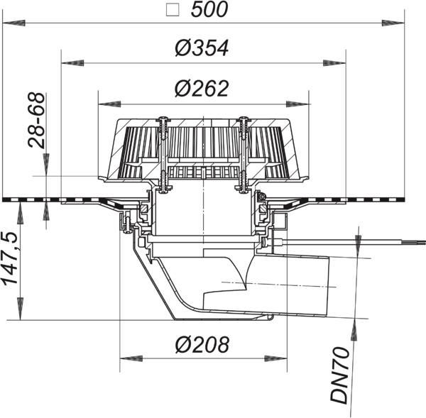 Ablaufleistungen nach DIN EN 1253, für den Einbau in Dachentwässerungsanlagen mit Druckströmung, Ablaufgehäuse wärmegedämmt, Ablaufstutzen DN 70 seitlich, 3° abgewinkelt, SuperDrain-Einsatz, Anstauelement höhenverstellbar 28-68 mm, Laubfangkorb, verschraubt, Polypropylen, UV-stabilisiert, werkseitig aufgeschweißter Bitumenschweißbahn-Manschette, 500 x 500 mm, 5 mm stark, mit Edelstahl-Flanschring zur zusätzlichen Sicherheit, Direktanschluss an 230 V, Heizband nach VDE 0721, Teil 1/3.78 geprüft, Leistungsaufnahme pro Dachablauf 15 W, Rechnungswert für Absicherung pro Dachablauf 0,06 Ampere, empfohlene Absicherung pro Dachanlage 16 Ampere