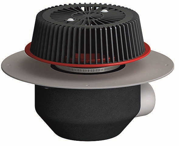 Ablaufleistungen nach DIN EN 1253, für den Einbau in Dachentwässerungsanlagen mit Druckströmung, Ablaufgehäuse wärmegedämmt, Ablaufstutzen DN 70 seitlich, 3° abgewinkelt, SuperDrain-Einsatz, Anstauelement höhenverstellbar 28-68 mm, Laubfangkorb, verschraubt, extra breitem Flansch zum Anschluss von PVC-Dachbahnen, aus PVC