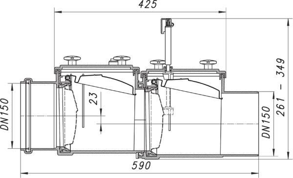 Typ 2 gemäß EN 13564-1:2002 (DN 100-150), Einsatzbereich nach DIN 1986-100:2002-03: geeignet für fäkalienfreies Abwasser, zwei automatisch wirkende Rückstauklappen aus Edelstahl, zusätzliche Handabsperrung (Notverschluss), Verschlussgestänge aus Edelstahl, Prüfrohranschluss, Gehäuse aus schlagfestem ABS-Kunststoff, Gehäusedeckel mit Knebelschrauben zur Wartung ohne Werkzeug