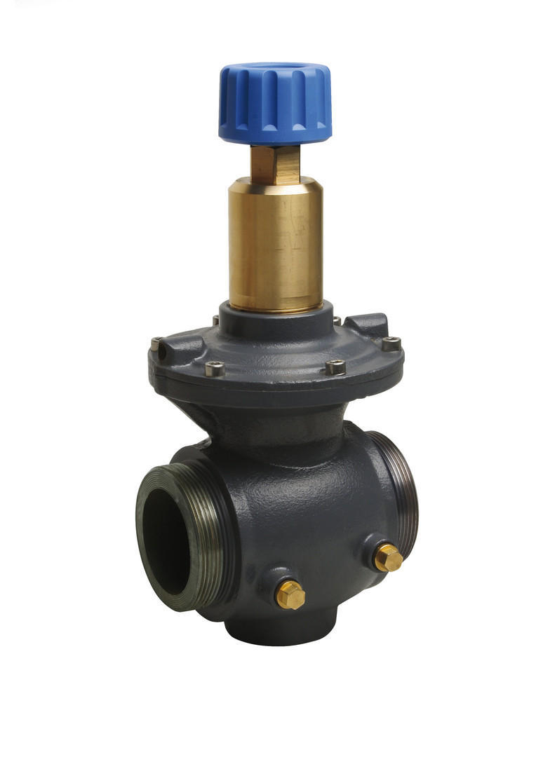 Flansch nach DIN EN 1092-2, Gehäuse aus Gusseisen EN-GJL250 (GG25), Baulänge nach DIN EN 558-1 Reihe 1, mit Impulsleitung 2,5 m und Anschlussnippel für MSV-F2 (003Z0691 und 003L8151), integrierte Absperrung mit blauem Handrad, max. Differenzdruck über dem Ventil 2,5 bar, max. Wassertemperatur 120°C, PN 16, Einbau im Rücklauf, ohne Isolierschale