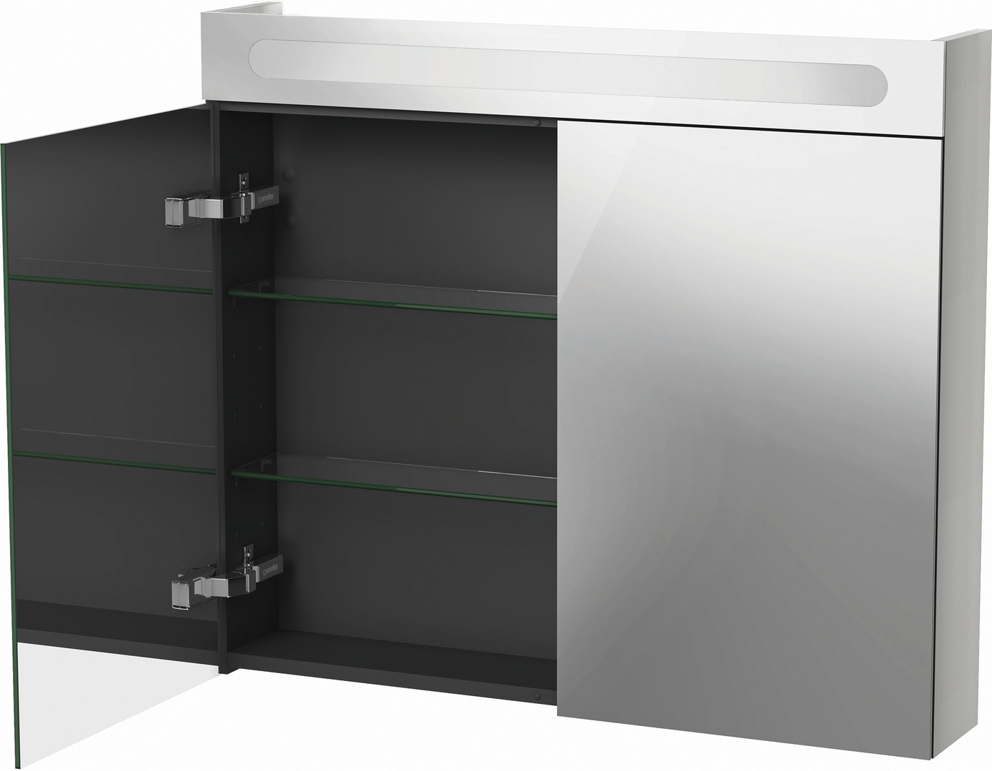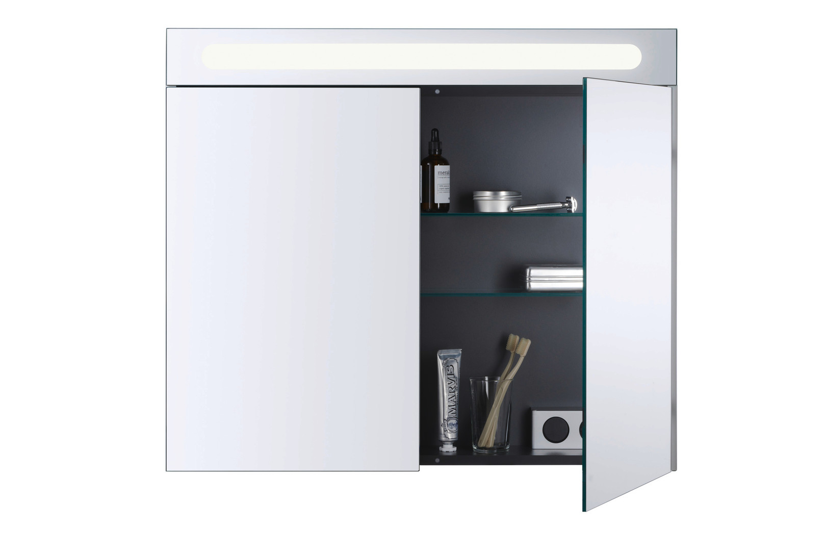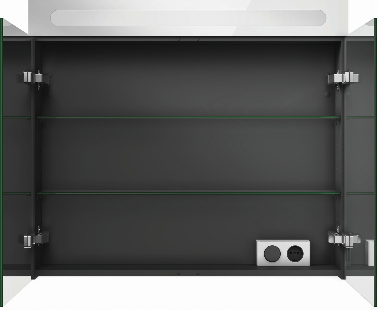 Better Version, IP44, 2 Spiegeltür, 2 Glasfachböden, 1 Schalter- Steckdoseneinheit innen rechts, LED (Lebensdauer >30.000 Stunden), LED fest verbaut, LED Modul 4000 Kelvin Lichtfarbe, Dreischicht-Holzspanplatte, beidseitig mit Schichtstoff (HPL) verpresst, Unterseite (HPL) Farbe Diamantschwarz, ABS-Kanten