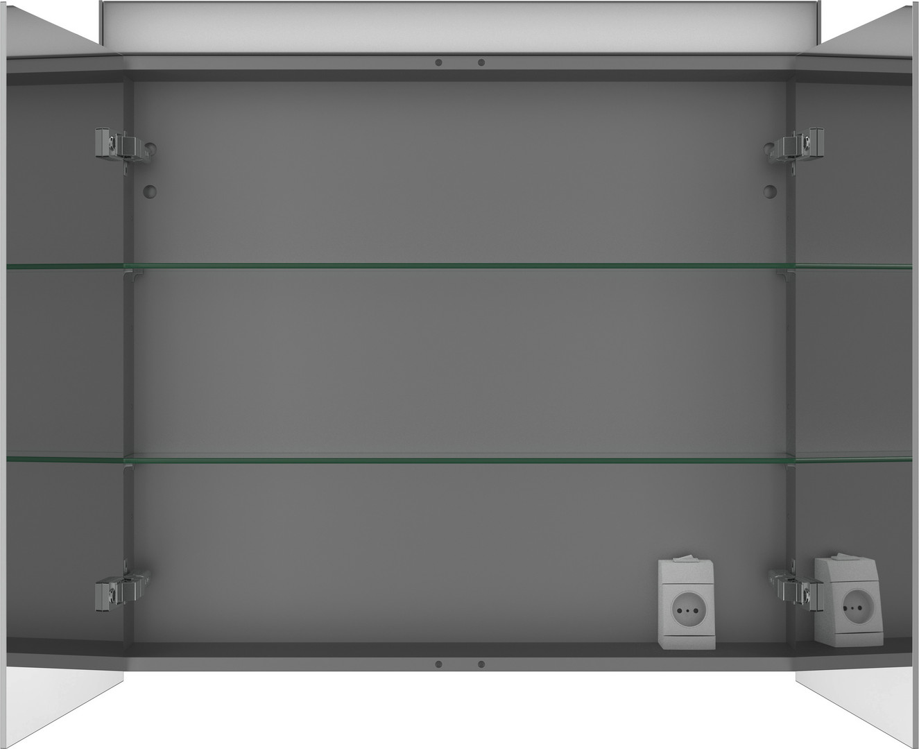 IP44, 2 Spiegeltüren, 2 Glasfachböden, 1 Schalter- Steckdoseneinheit innen rechts, Einbaufähig nur mit Einbauset, LED (Lebensdauer >30.000 Stunden), LED fest verbaut, LED Modul 4000 Kelvin Lichtfarbe