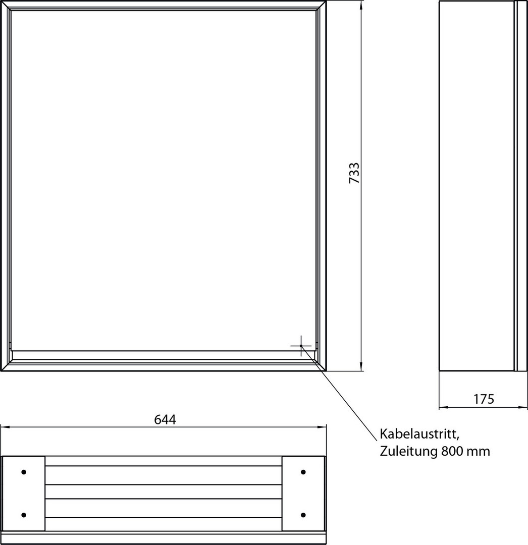 IP 20, Seitenwände verspiegelt, mit verspiegelter- oder weißer Rückwand, 2 stufenlos einstellbare Ablagen, 1 Steckdose, Lichtsteuerung über 3 kapazitive von außen bedienbare Touch-Bedienfelder (An/Aus, Helligkeit und Lichtfarbe - kalt/warm - stufenlos einstellbar), Kabeldurchlass nach außen bei geschlossenen Spiegeltüren