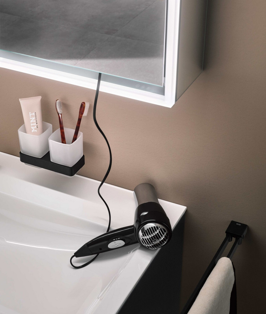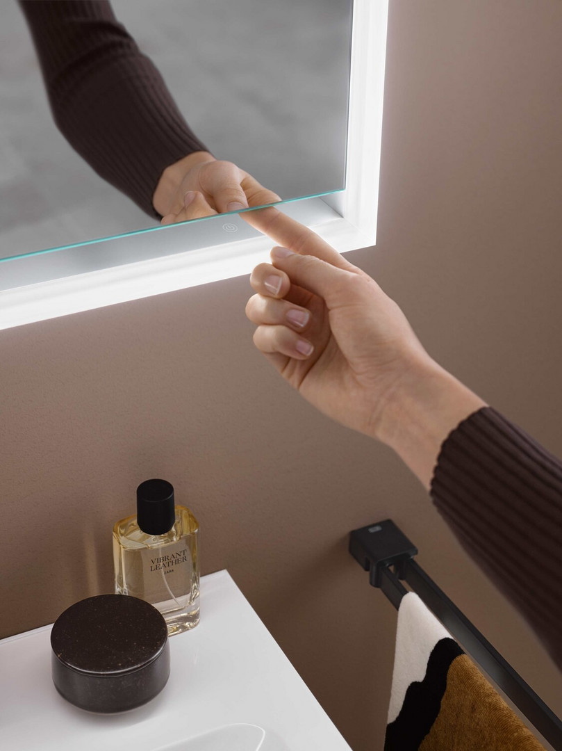 IP 20, mit verspiegelter- oder weißer Glasrückwand Rückwand, 2 stufenlos einstellbare Ablagen, 1 Steckdose, Lichtsteuerung über 3 kapazitive von außen bedienbare Touch-Bedienfelder (An/Aus, Helligkeit und Lichtfarbe - kalt/warm - stufenlos einstellbar), Kabeldurchlass nach außen bei geschlossenen Spiegeltüren
