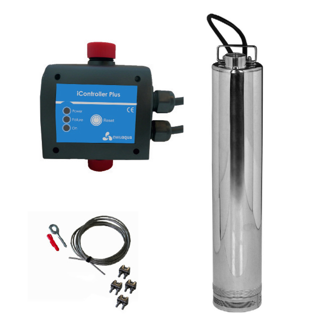 Tauchdruckpumpe, Druckschalter und Befestigungs-Set, mehrstufige, mediumgekühlte 4" Tauchdruckpumpe aus Edelstahl für vertikalen oder horizontalen Einbau, für Dauerlauf geeignet, fördert sauberes, klares Wasser mit Temperatur bis 35 °C, max. Eintauchtiefe 17 m, max. Fördermenge an Sand 60 gr/m3, zur Wasserversorgung aus Zisternen im privaten Bereich, elektronischer Druckschalter, der Pumpe druckabhängig einschaltet und strömungsabhängig (mit einer Nachlaufzeit von 10 sec.) ausschaltet, Einschaltdruck ist mittels Stellschraube und Druckmesser von 1,5-3,5 bar einstellbar, Druckschalter mit Trockenlaufschutz und automatischer Reset-Funktion zum mehrmaligen Starten nach Betriebsstörung sowie einer Gummimembran mit Feder als kleiner Wasserpuffer, um bei kleinsten Leckagen die Pumpe vor zu häufigem Anlaufen zu schützen, Schutzklasse IP 65, zum trockenen, frostfreien und vertikalen Einbau geeignet