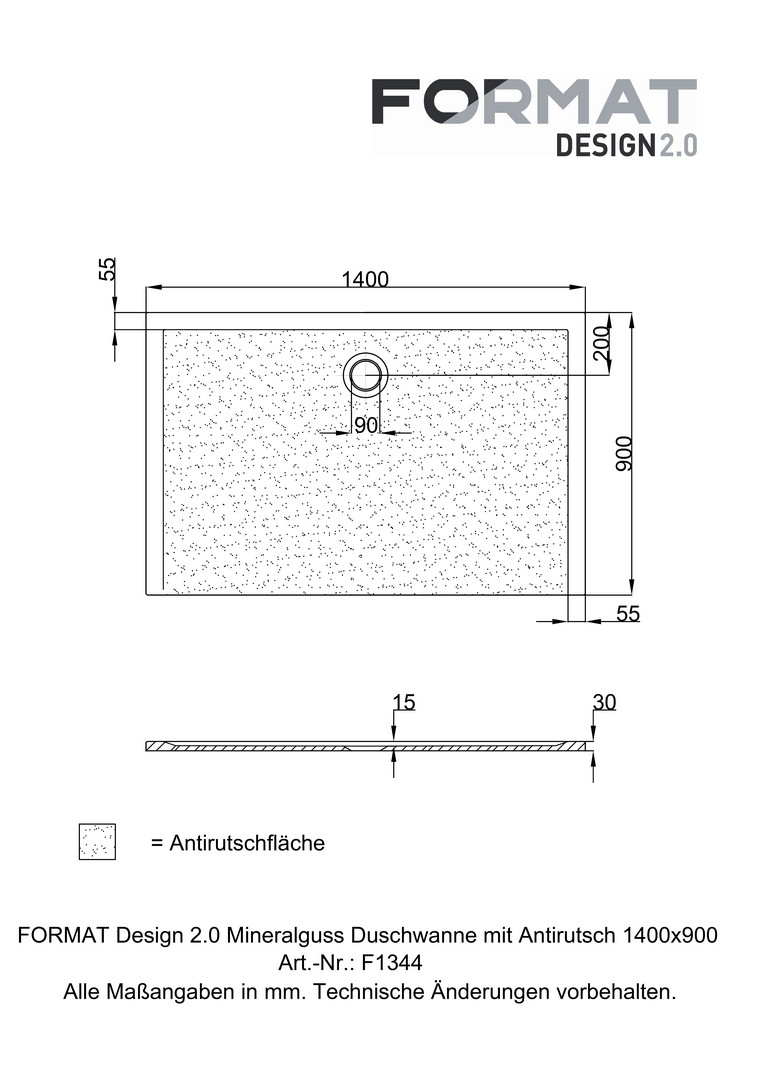FORMAT Design 2.0 Duschwanne Mineralguss 140 x 90 x 3 cm, weiß, mit Antirutsch