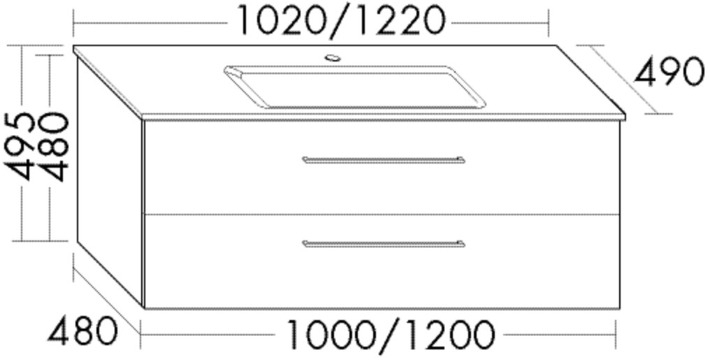 Glas-Waschtisch (weiß A0133), Muldentiefe: 90 mm, Beckenmaß: 580 x 295 mm, mit Ab- und Überlaufsystem (Geberit), Glasabdeckung weiß, Waschtischunterschrank: 2 Auszüge, mit Raumsparsiphon