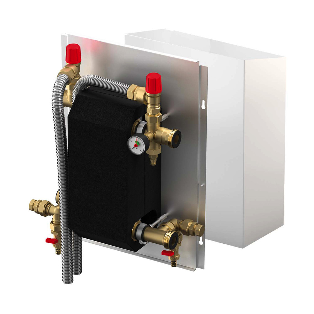 Anschlussgruppe mit Wärmetauscher zum Schutz sensibler Bauteile, vormontierte kompakte Wärmetauschergruppe mit integrierten KFE-Hähnen und Sicherheitsventil, Anschlussmöglichkeiten im Primär- und Sekundär-Kreis für Ausdehnungsgefäß, zur Wandmontage mit weißer Stahlblechhaube