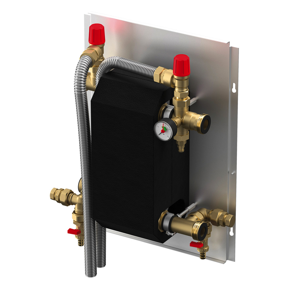 Anschlussgruppe mit Wärmetauscher zum Schutz sensibler Bauteile, vormontierte kompakte Wärmetauschergruppe mit integrierten KFE-Hähnen und Sicherheitsventil, Anschlussmöglichkeiten im Primär- und Sekundär-Kreis für Ausdehnungsgefäß, zur Wandmontage mit weißer Stahlblechhaube