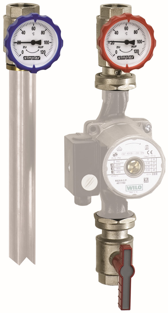 Dichtmaterialien aus EPDM/PTFE, max. Betriebstemperatur 110 °C Dauertemperatur/130 °C kurzzeitig, max. Betriebsdruck 10 bar, bestehend aus: 1x Pumpen-Kugelhahn mit Schwerkraftbremse und rotem Thermometergriff, 1x Muffen-Kugelhahn mit blauem Thermometergriff, 1x Pumpen-Kugelhahn mit rotem Flügelgriff