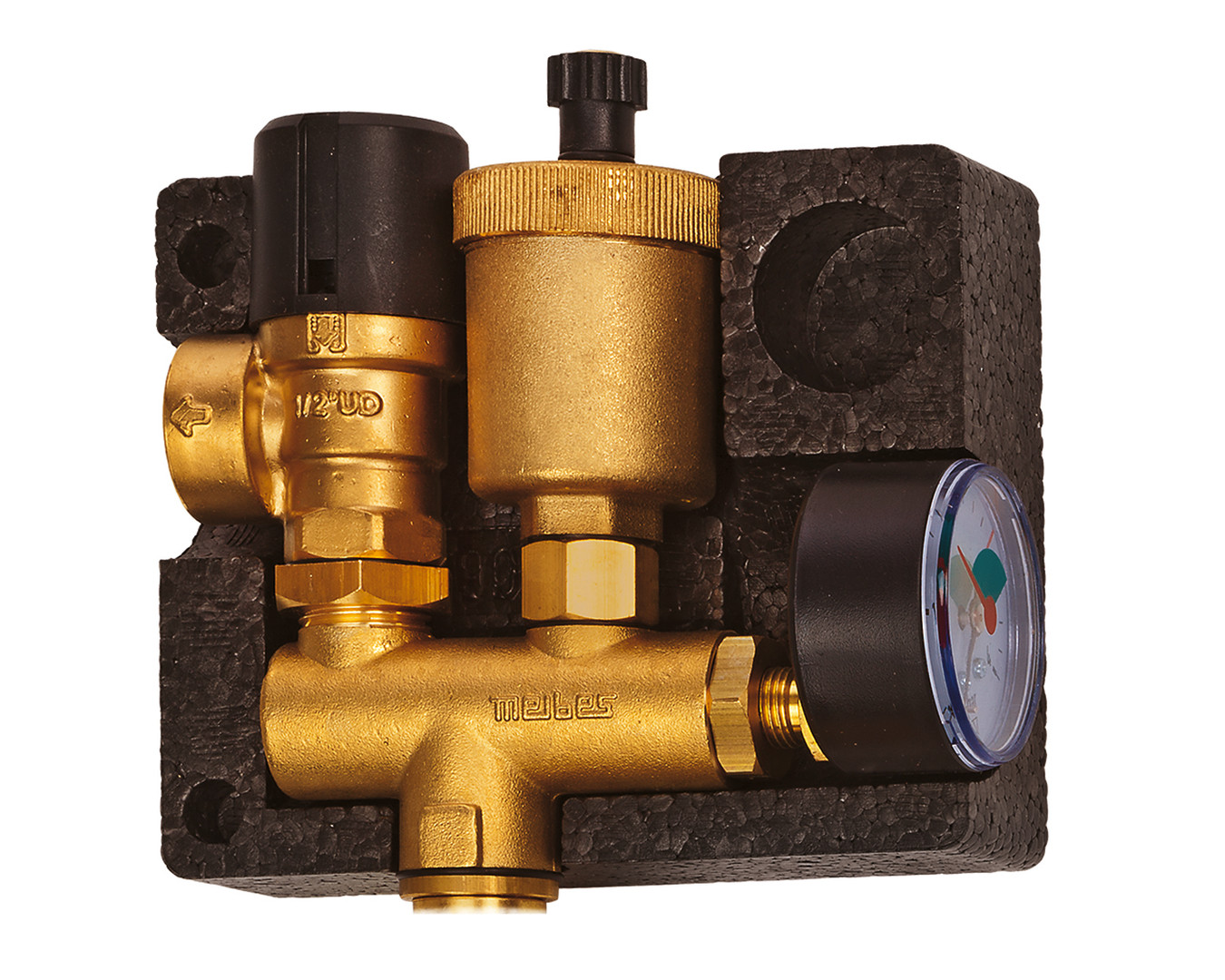 bestehend aus Verteilerstück mit Anschluss 1/2" F mit Sicherheitsventil 1/2" x 3/4", 3 bar mit Manometer 4 bar und Entlüftungsautomat