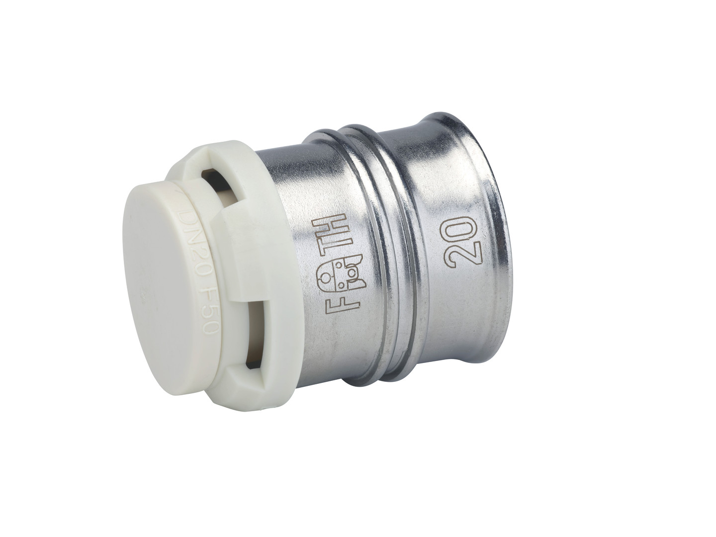 zum Verschließen von Rohrenden in Trinkwasser- und Heizungssystemen mit weißem Fixierring mit integrierten Sichtfenstern, fixierter Edelstahlpresshülse, Durchflussoptimiert mit Leckagefunktion, unverpresst undicht bei Druckprobe mit Wasser bei 1 - 6,5 bar, Verpressbar mit den Presskonturen F und TH