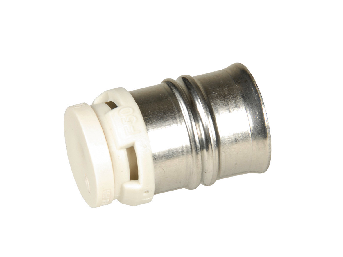 zum Verschließen von Rohrenden in Trinkwasser- und Heizungssystemen mit weißem Fixierring mit integrierten Sichtfenstern, fixierter Edelstahlpresshülse und Leckagefunktion