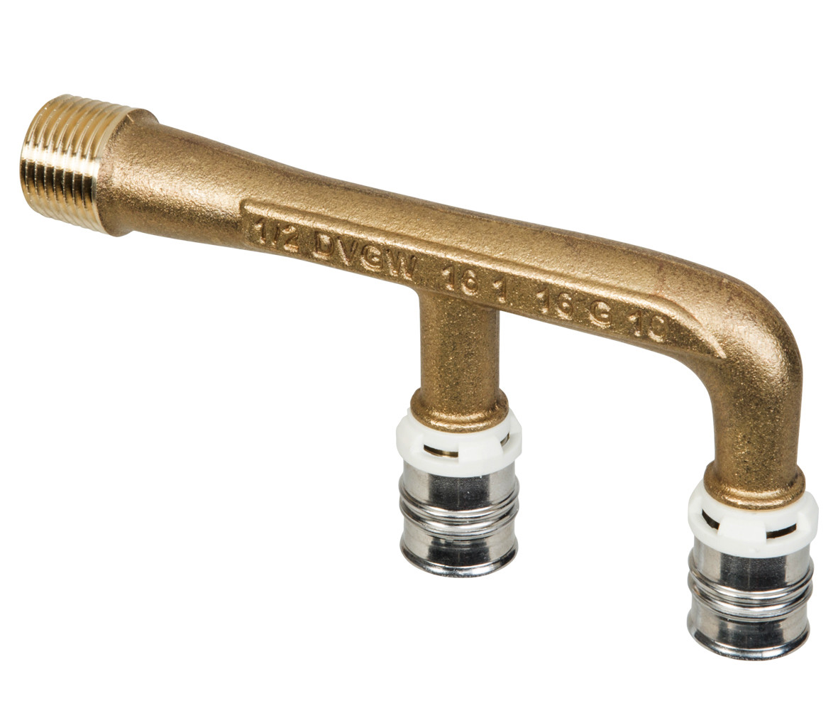 nach DIN EN 10226-1, aus entzinkungsbeständiger bleifreier Siliziumbronze, für den Armaturenanschluss in Ring- und Reiheninstallationen in Trinkwassersystemen, mit weißen Fixierringen mit integrierten Sichtfenstern, fixierten Edelstahlpresshülsen, Durchflussoptimiert mit Leckagefunktion, unverpresst undicht bei Druckprobe mit Wasser bei 1 - 6,5 bar, Verpressbar mit den Presskonturen F und TH