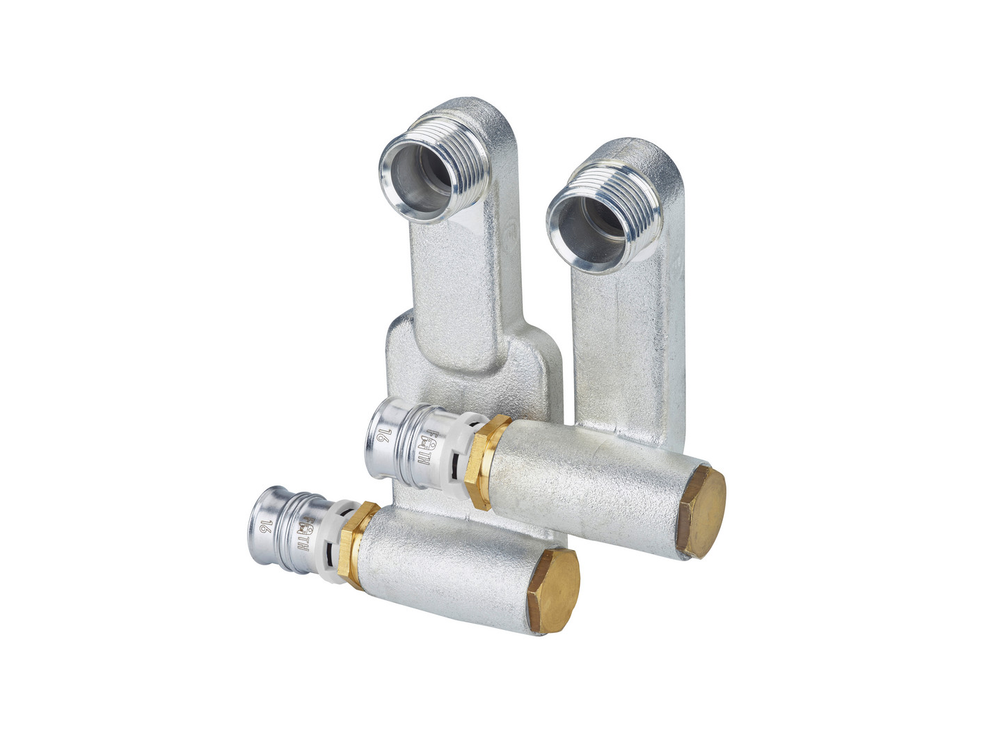 für den Anschluss von Heizkörpern aus der Sockelleiste, mit weißen Fixierringen mit integrierten Sichtfenstern, fixierten Edelstahlpresshülsen und Leckagefunktion, Verpressbar mit den Presskonturen F und TH