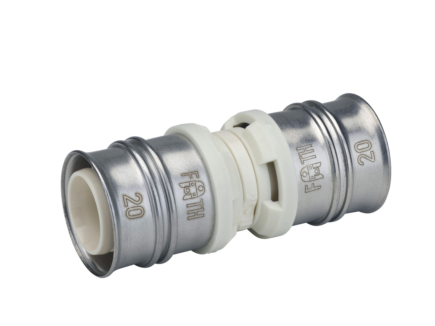 zur Installation von Trinkwasser- und Heizungssystemen mit weißem Fixierring mit integrierten Sichtfenstern, fixierter Edelstahlpresshülse, Durchflussoptimiert mit Leckagefunktion, unverpresst undicht bei Druckprobe mit Wasser bei 1 - 6,5 bar, Verpressbar mit den Presskonturen F und TH