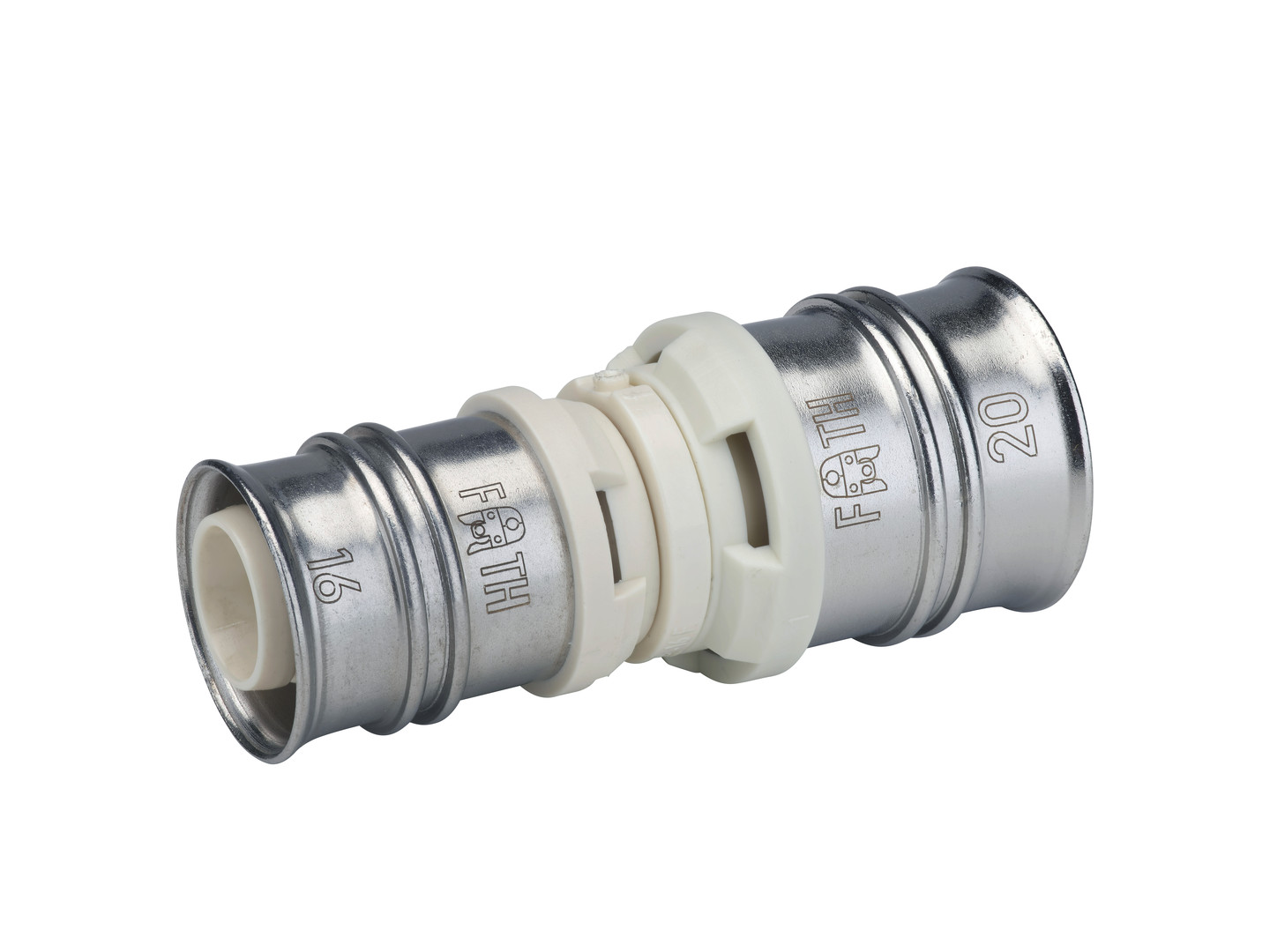zur Installation von Trinkwasser- und Heizungssystemen mit weißem Fixierring mit integrierten Sichtfenstern, fixierter Edelstahlpresshülse, Durchflussoptimiert mit Leckagefunktion, unverpresst undicht bei Druckprobe mit Wasser bei 1 - 6,5 bar, Verpressbar mit den Presskonturen F und TH