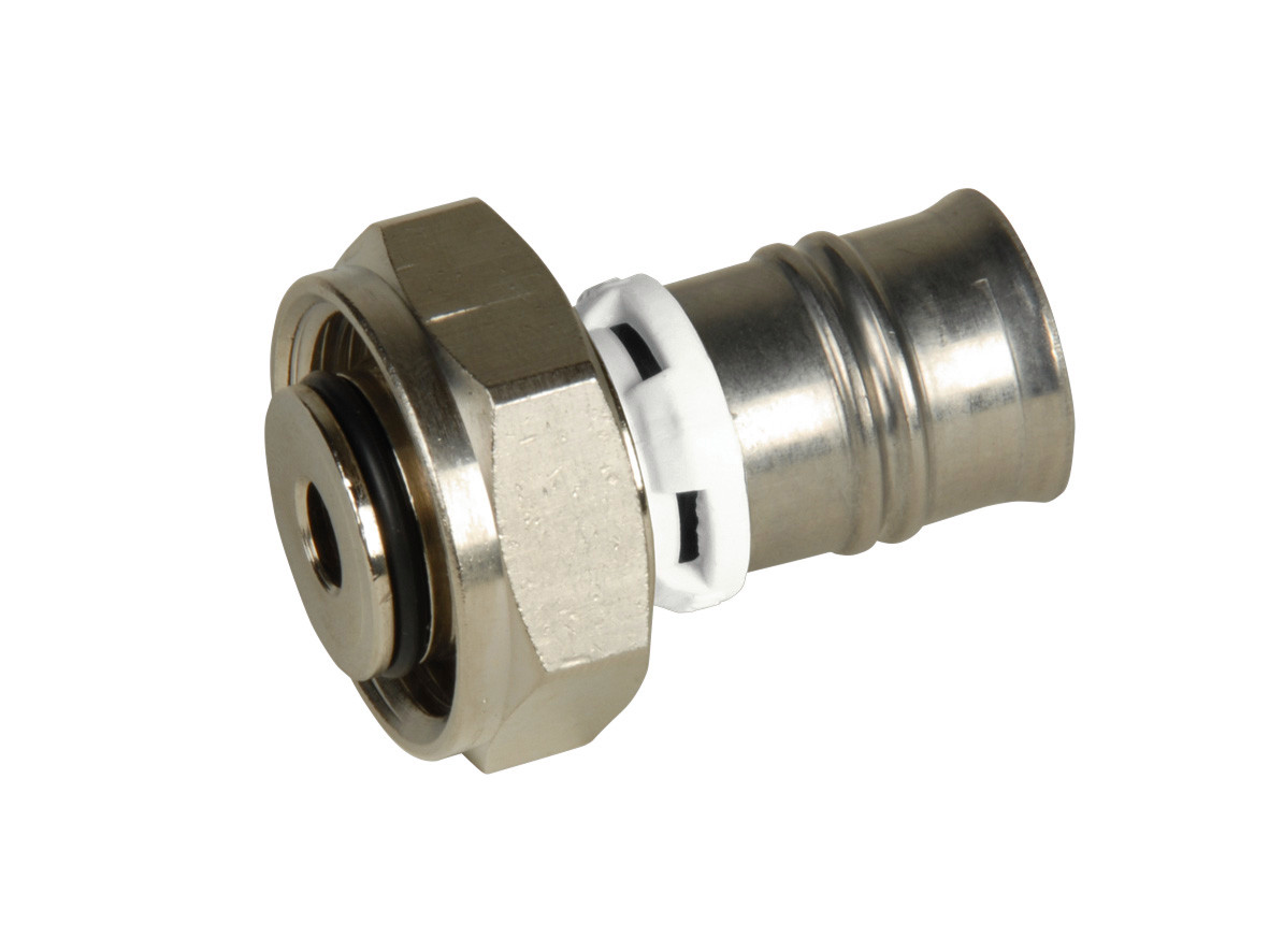 IG nach DIN EN ISO 228 und Eurokonus aus entzinkungsbeständigem Messing mit weißem Fixierring mit integrierten Sichtfenstern, fixierter Edelstahlpresshülse und Leckagefunktion zum Anschluss von alpex Rohren an Geräte, Armaturen und Formstücken mit Eurokonus