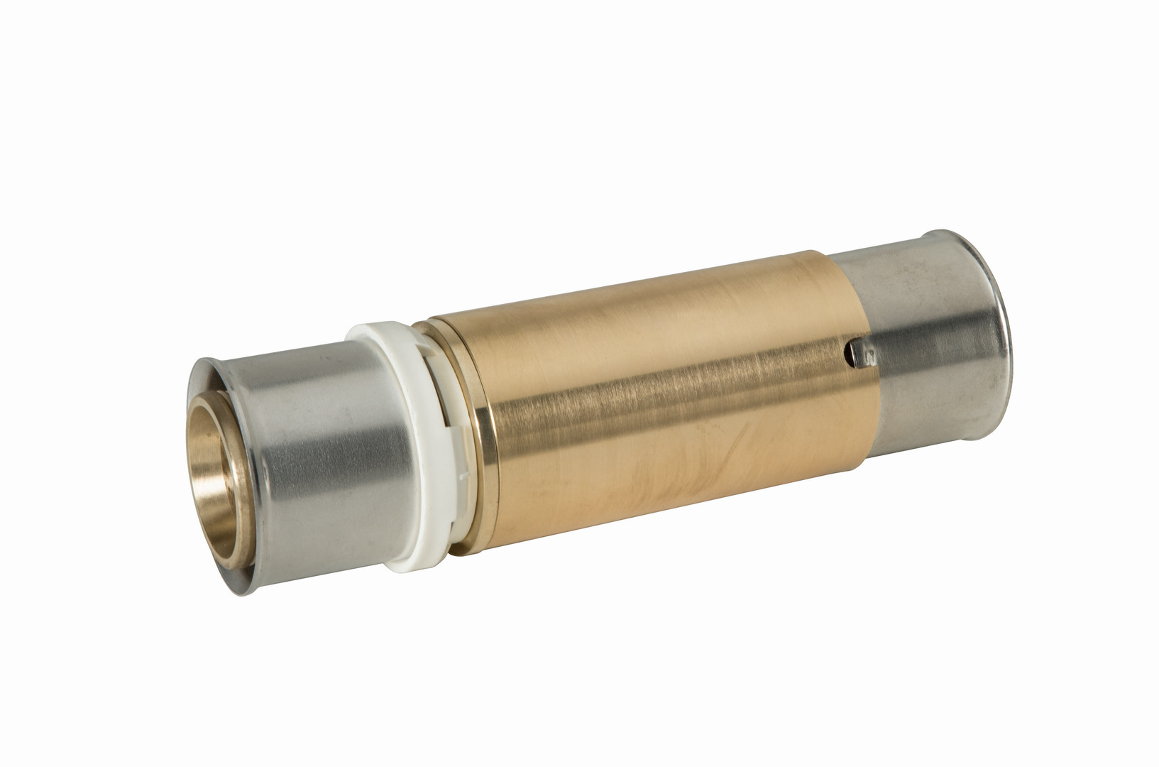zur Reparatur von alpex Mehrschichtverbundrohren und zum nachträglichen Einbau von Formteilen in Trinkwasser- und Heizungssystemen mit weißem Fixierring mit integrierten Sichtfenstern, fixierten Edelstahlpresshülsen und Leckagefunktion