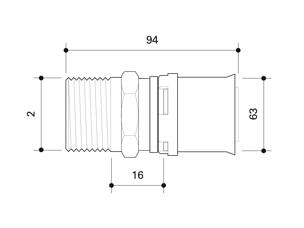 Fränkische Übergang alpex L 63 mm x R 2, mit AG, entzinkungsbeständiges Messing