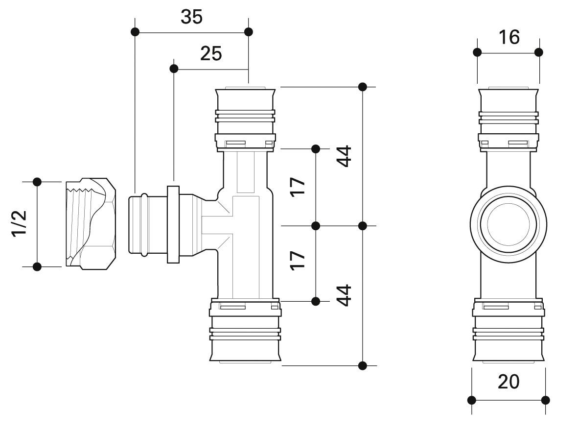Fränkische Übergangs-T-Stück alpex F50 PROFI 20 mm x G 1/2 x 16 mm, entzinkungsbeständiges Messing 203850