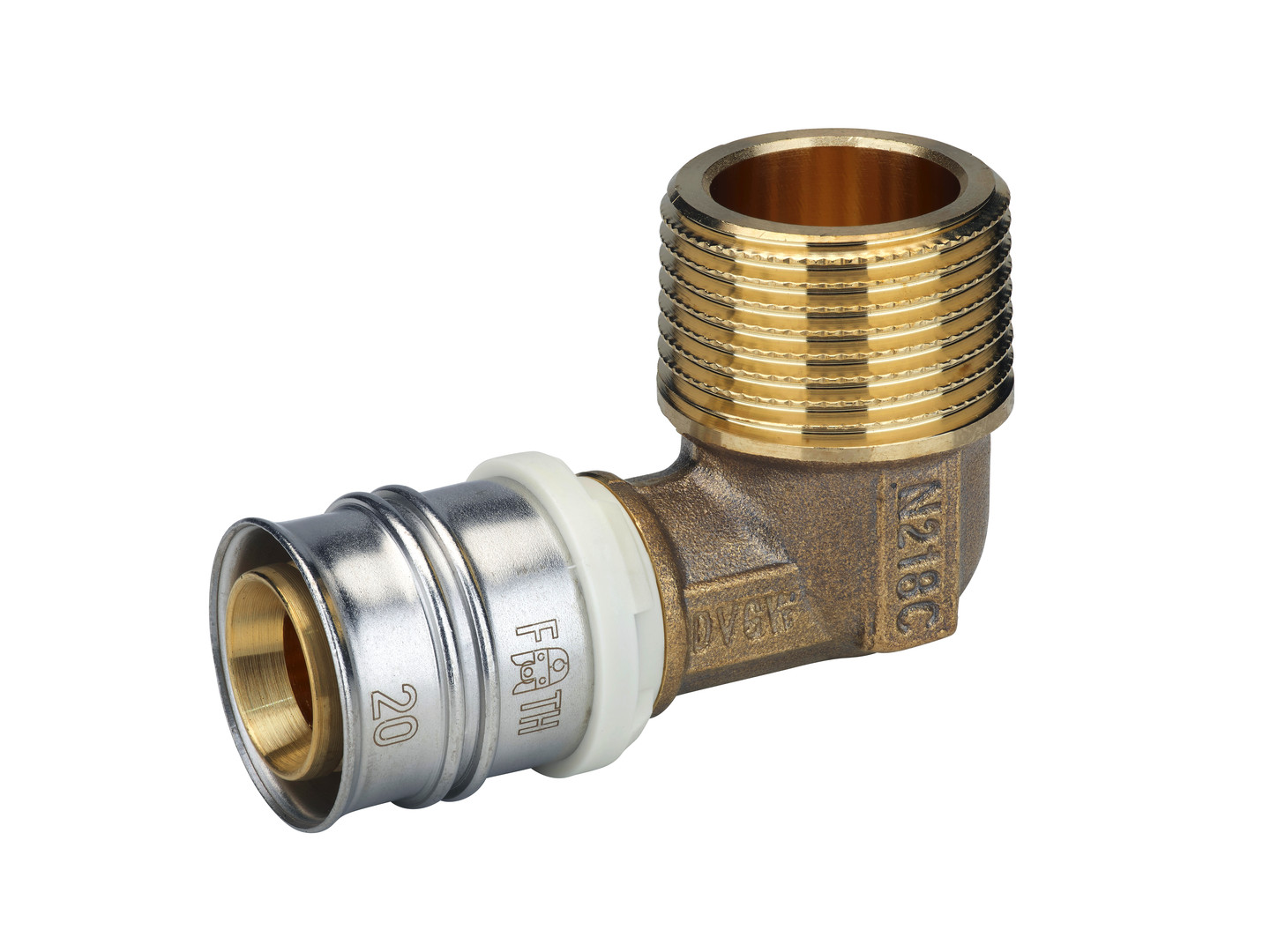 nach DIN EN 10226-1, aus entzinkungsbeständiger bleifreier Siliziumbronze zur Installation von Trinkwasser- und Heizungssystemen mit weißem Fixierring mit integrierten Sichtfenstern, fixierter Edelstahlpresshülse, Durchflussoptimiert mit Leckagefunktion, unverpresst undicht bei Druckprobe mit Wasser bei 1 - 6,5 bar, Verpressbar mit den Presskonturen F und TH