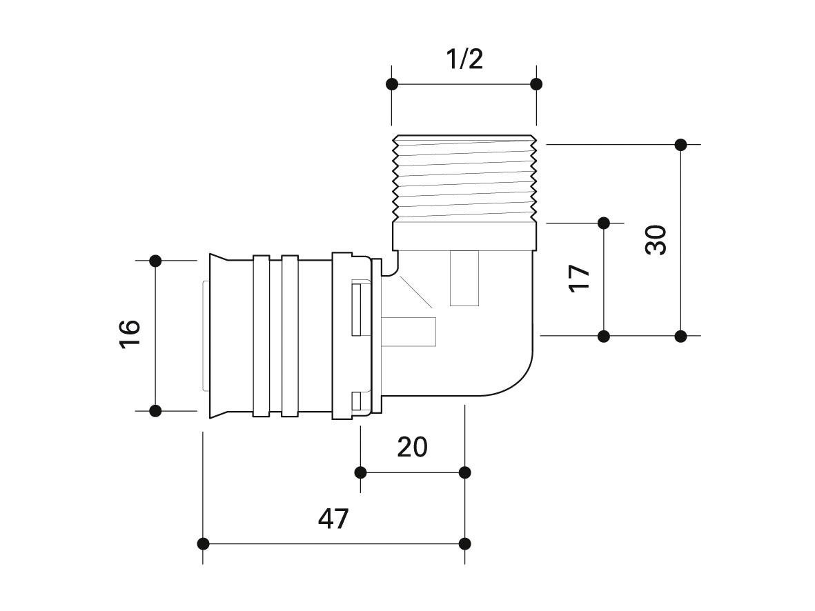 Fränkische Übergangswinkel alpex F50 PROFI 16 mm x R 1/2, 90Grad, mit AG, entzinkungsbeständiges Messing