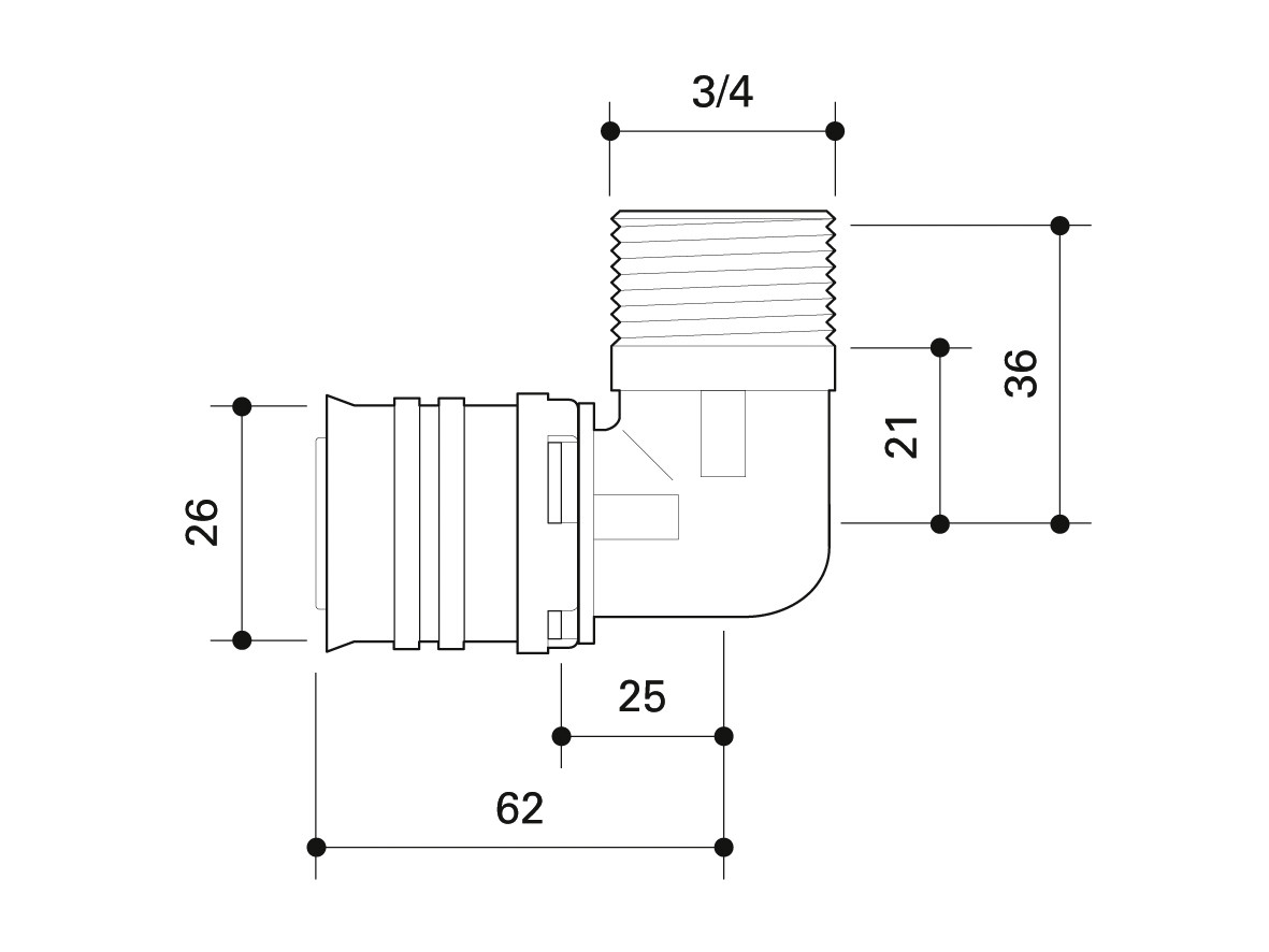 Fränkische Übergangswinkel alpex F50 PROFI 26 mm x R 3/4, 90Grad, mit AG, entzinkungsbeständiges Messing 155220
