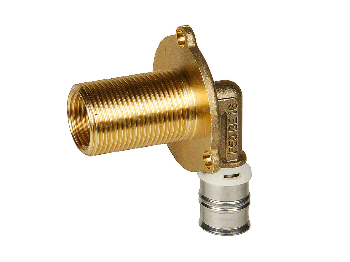 Winkel 90° mit Flansch mit Innen- und Außengewinde aus für den Einbau in Unterputzspülkästen oder Leichtbauwänden in Trinkwassersystemen mit weißem Fixierring mit integrierten Sichtfenstern, fixierter Edelstahlpresshülse und Leckagefunktion