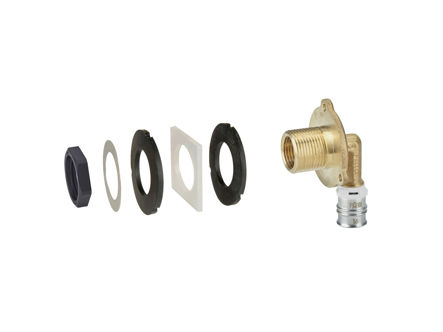 mit Flansch, mit Innen- und Außengewinde aus entzinkungsbeständiger bleifreier Siliziumbronze, inklusive Montageset Typ „UP" für den Einbau in Unterputzspülkästen in Trinkwassersystemen, mit weißem Fixierring mit integrierten Sichtfenstern, fixierter Edelstahlpresshülse, Durchflussoptimiert mit Leckagefunktion, unverpresst undicht bei Druckprobe mit Wasser bei 1 - 6,5 bar, Verpressbar mit den Presskonturen F und TH