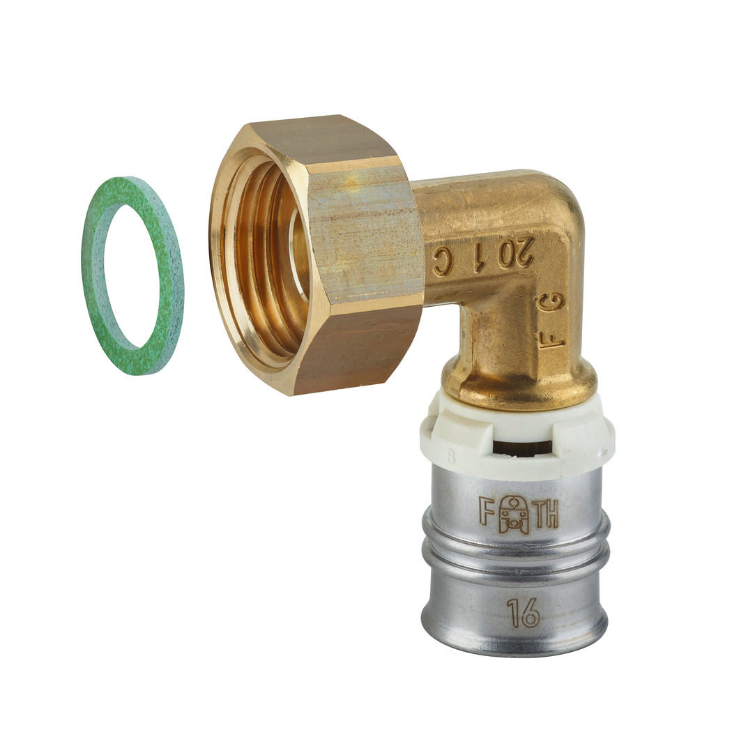 aus entzinkungsbeständiger bleifreier Siliziumbronze zum Herstellen von lösbaren Verbindungen in Trinkwasser- und Heizungssystemen mit weißem Fixierring mit integrierten Sichtfenstern, fixierter Edelstahlpresshülse, Durchflussoptimiert mit Leckagefunktion, unverpresst undicht bei Druckprobe mit Wasser bei 1 - 6,5 bar, Verpressbar mit den Presskonturen F und TH