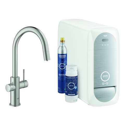 GROHE Spültisch-Einhebelmischer Blue Home C-Auslauf, Starter Kit, mit herausziehbarer Mousseurauslauf, supersteel W294639
