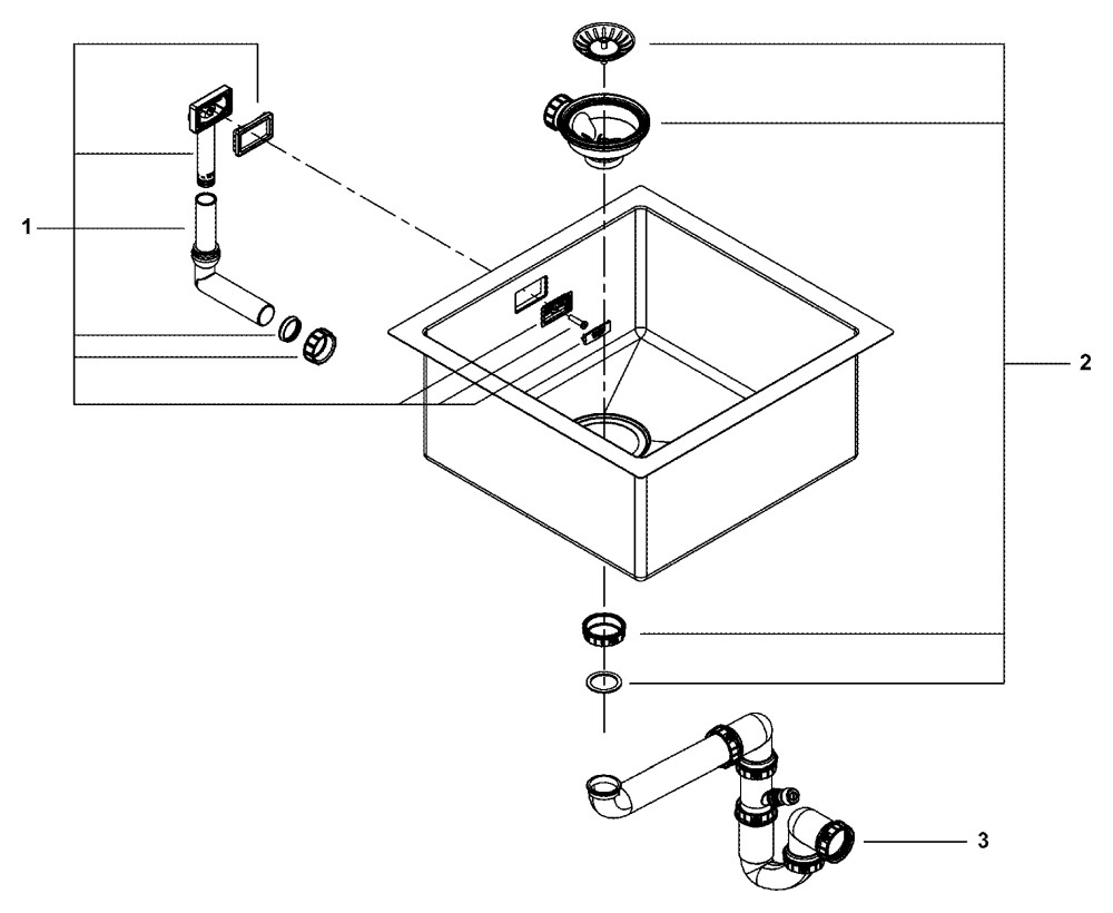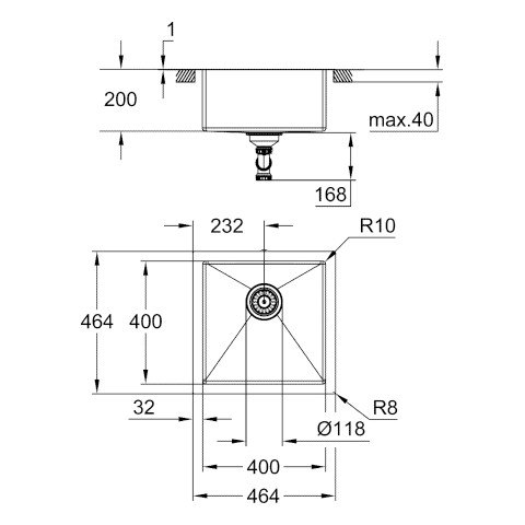 Material Edelstahl AISI 304 (V2A), Materialstärke 1 mm, Long-Life Oberfläche, Oberfläche Satin Finish, Whisper, min. Maß Unterschrank 45 cm, 1 Becken 40 x 40 x 20 cm, Außenradius R11 (Unterbau), R3 (aufliegend), Innenradius R10, FastFixation Schnellbefestigungssystem, Ausschnittmaß (Unterbau) 40,2 x 40,2 cm (R11) Ausschnittmaß (aufliegend/flächenbündig) 44,9 x 44,9 cm (R3), Ablauf Ø 3,5"/9 cm Siebkorbventil, Zubehör beiliegend: Ablaufgarnitur, Siebkorbventil, Montageset, alternative Push-Exzenterbedienung in rund (40 986 SD0) separat bestellbar, Anzahl der enthaltenen Befestigungsklammern 8