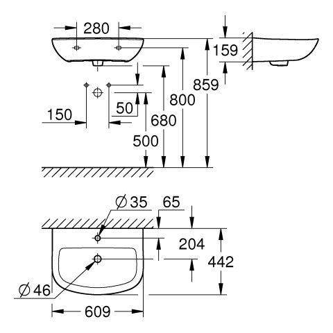 GROHE Waschtisch Bau Keramik 60,9 x 44,2 cm, 1 Hahnloch, mit Überlauf, wandhängend, alpinweiß