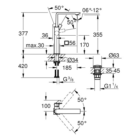 Einlochmontage, schwenkbarer Auslauf, für freistehende Waschschüsseln, SilkMove 28 mm Keramikkartusche, Long-Life Oberfläche, max. Durchfluss bei 3 bar 5 l/min, Water Saving weniger Wasser, glatter Körper, AquaGuide verstellbarer Slim Air Mousseur, Ausladung 185 mm, Höhe 377 mm, Push-Open Ablaufgarnitur 1 1/4", flexible Anschlussschläuche, mit Temperaturbegrenzer