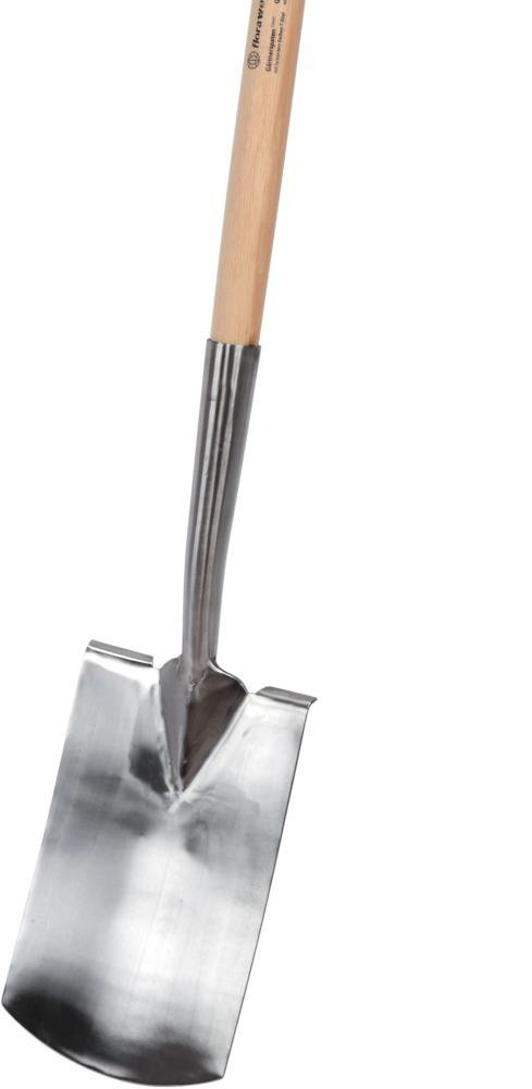 Dieser Gärtnerspaten ist aus Edelstahl mit einem polierten und gehärteten Spatenblatt.