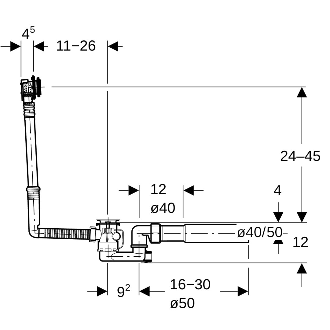 Geberit Badewannenablauf d52 mit Drehbetätigung und Zulauf, mit Fertigbauset, Länge 26cm, hochglanz-verchromt