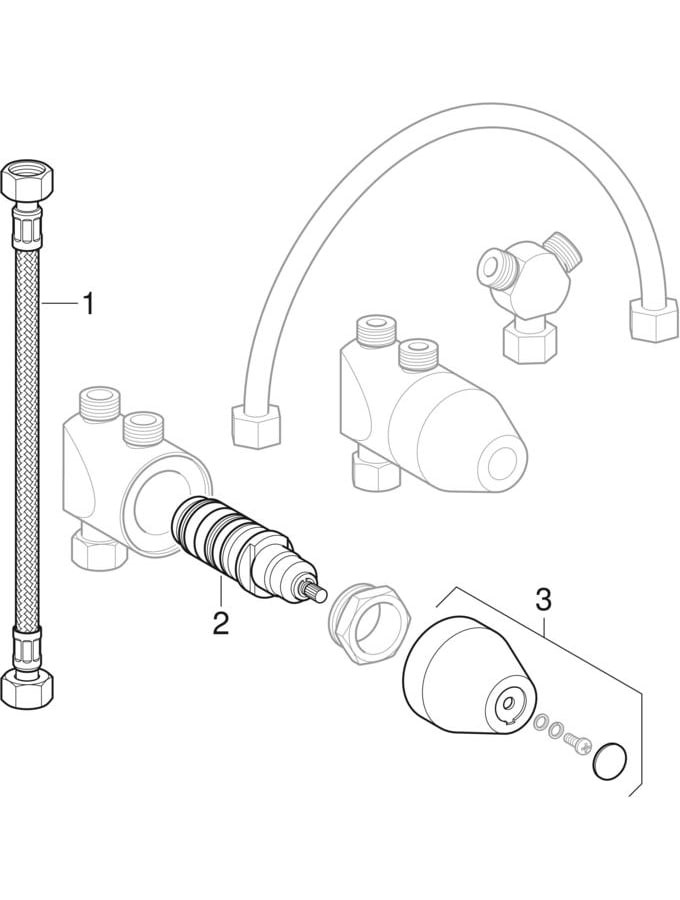 für Waschtischarmaturen Bambini, zum Einstellen und Begrenzen der Warmwassertemperatur, zum Verhindern von Verbrühungen bei Ausfall der Kaltwasserversorgung, zur Montage auf Eckventil 3/8", Armaturengruppe I nach DIN 4109, Verbrühschutz durch thermische Dehnstoffelemente nach EN 1111, max. Wassertemperatur am Auslauf an Thermostatkartusche einstellbar, Betriebsdruck 100-500 kPa, Betriebstemperatur Warmwasser 60-65 °C, Betriebstemperatur für Kaltwasser 10-15 °C, Durchfluss bei 300 kPa 12 l/min, Werkstoff Messing verchromt, bestehend aus Y-Stück, Panzerschlauch 3/8", Korbfilter