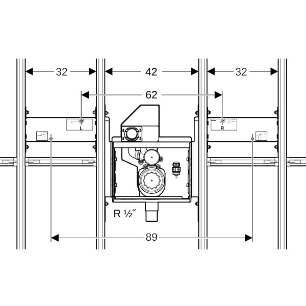 zum Einbau in GIS Tragsysteme für Vorwände, Trennwände oder freistehende Wände, für ONE Waschtische, für ONE Möbelwaschtische, für UP-Armaturen, Passend zu ONE, UP-Geruchsverschluss mit Serviceöffnung, Wandeinbaukasten mit Anschlussstutzen aus PE, Ø 50/56 mm, Elektroanschlussdose im UP-Gehäuse, mit 2 Konsolen, Bauschutze, 2 Gewindestangen M10, Kupplungsbuchse für Netzanschluss, Befestigungsmaterial