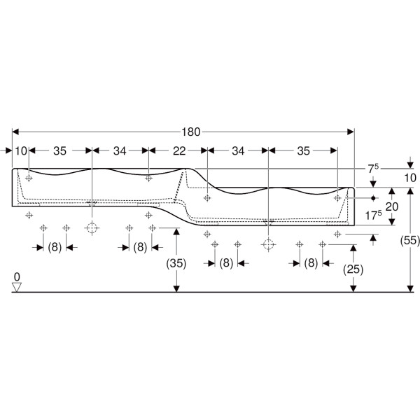 ohne Hahnloch/Überlauf, zur Montage an Montagewinkeln, für Schulen, Kinderbetreuungs- und andere Bildungseinrichtungen, für Kinder, 4x Waschplätze, 2 Abgänge, verkürzte Ausladung, wellenförmiger Rand für Zugänglichkeit zur Armatur, abgerundete Kanten zum Vermeiden von Verletzungen, antibakteriell, schlagfest, kratzfest, nahtlose Oberflächenreparatur, aus Varicor, mit Stauscheibe aus PMMA