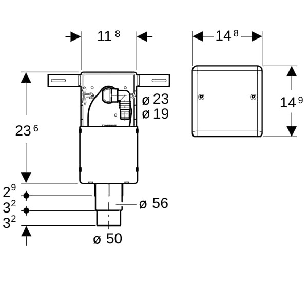 zum verdeckten Einbau, zum Anschließen von Waschmaschinen oder Geschirrspüler, güteüberwacht nach EN 274-3, Abdeckplatte aus Edelstahl, UP-Geruchsverschluss zur Reinigung herausnehmbar, Sperrwasserhöhe 70 mm, Kunststoff, bestehend aus Abdeckplatte, Winkelschlauchtülle aus PP-Ø 19/23 mm, Wandeinbaukasten, Bauschutz, Manschette aus EPDM und Befestigungsmaterial